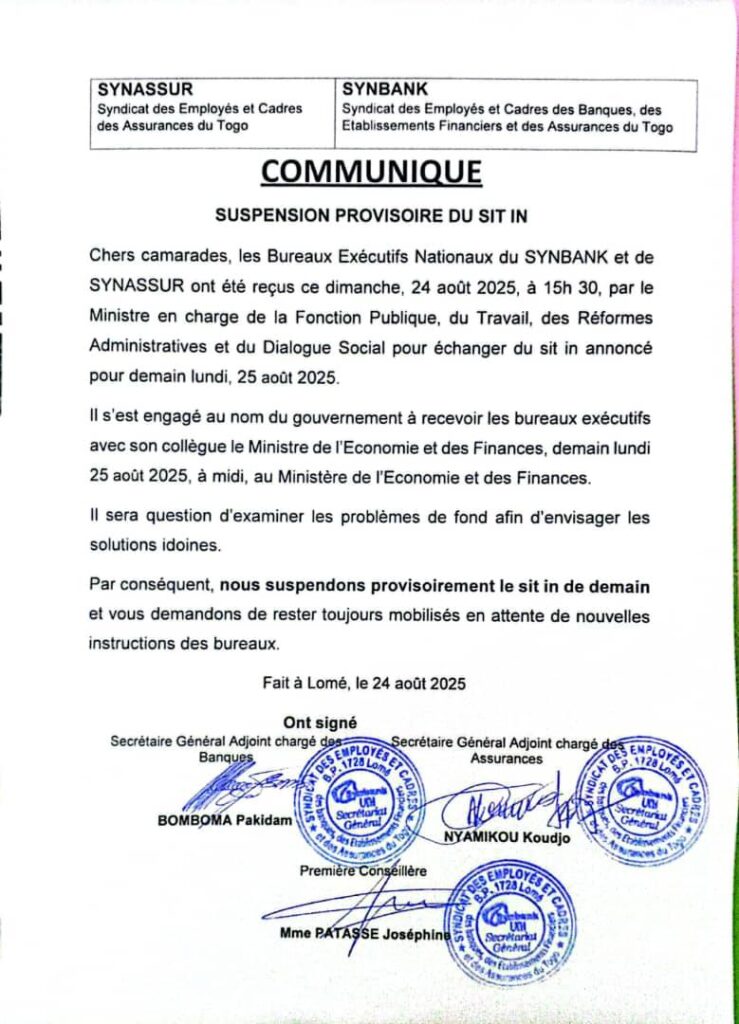 Le Syndicat des Employés et Cadres des Banques, des Établissements Financiers et des Assurances du Togo (SYNBANK) ainsi que le Syndicat des Employés et Cadres des Assurances du Togo (SYNASSUR) ont annoncé, ce dimanche 24 août 2025, la suspension temporaire du sit-in prévu pour ce lundi 25 août.