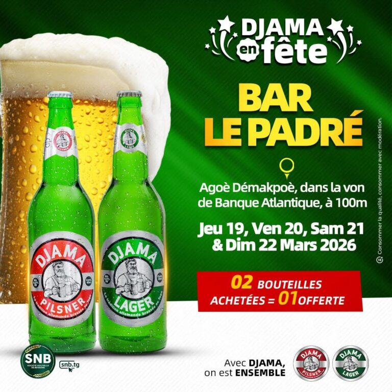 Vous êtes prêts à faire la fête comme il se doit ? Alors, rendez-vous au Bar Le Padré à Agoè Démakpoè, dans la voie de Banque Atlantique, à partir du jeudi 19 mars 2026 ! Pendant quatre jours, l’ambiance sera électrique avec DJAMA aux commandes.