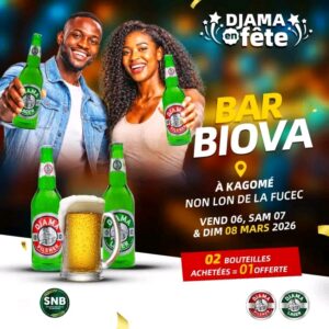 Les vendredi 06, samedi 07 et dimanche 08 mars 2026, le Bar Biova à Kagomé sera le lieu de rendez-vous des amateurs de bière et d’ambiance festive. La Société Nouvelle de Boissons (SNB) organise en effet une fête spéciale DJAMA avec une offre irrésistible : 2 bouteilles achetées = 1 offerte !
