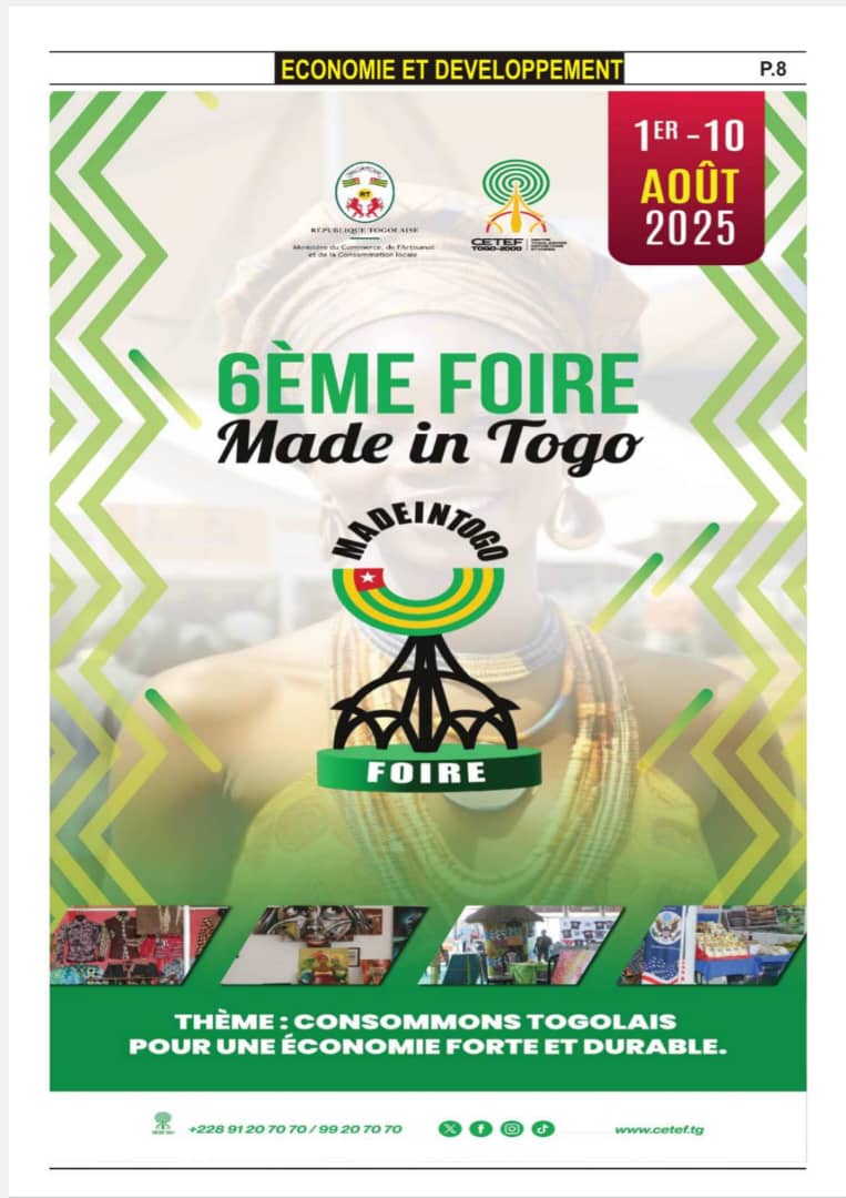 Du 1er au 10 août prochains, la 6è édition de la Foire Made in Togo, ouvrira ses portes au public togolais. Cet événement qui, depuis quelques années, fait la visibilité et la promotion des produits et services du pays, se déroulera au Centre Togolais des Expositions et Foires (CETEF) Togo 2000.