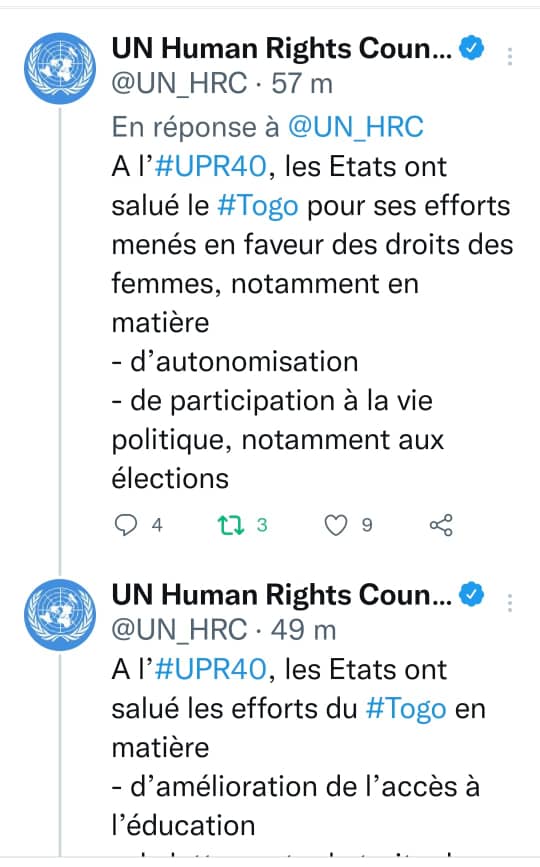 Nous le disions tantôt, 95 pays ont porté un intérêt particulier au passage du Togo. Tour à tour, tous ont encouragé l’engagement du Togo pour les Droits de l’Homme et ont salué les réformes et dispositions juridiques mises sur pieds au Togo en vue de renforcer et de garantir davantage les libertés et les Droits humains dans tous leurs compartiments.
