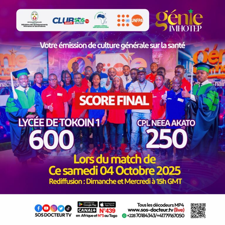 Le projet GENIE IMHOTEP initié par AIMES-AFRIQUE et qui est porté par la télévision SOS Docteur TV à travers les Club santé SOS Docteur TV, des lycées de la capitale, poursuit son chemin. Après le premier match, une seconde rencontre organisée sous forme d’émission, a opposé deux club des Lycées de Lomé à savoir: le lycée de Tokoin 1 et CPL NEEA d’Akato. Pour ce nouveau face à face, c’est le Club Santé SOS DOCTEUR TV du Lycée Tokoin 1 qui a su tirer son épingle du jeu.
