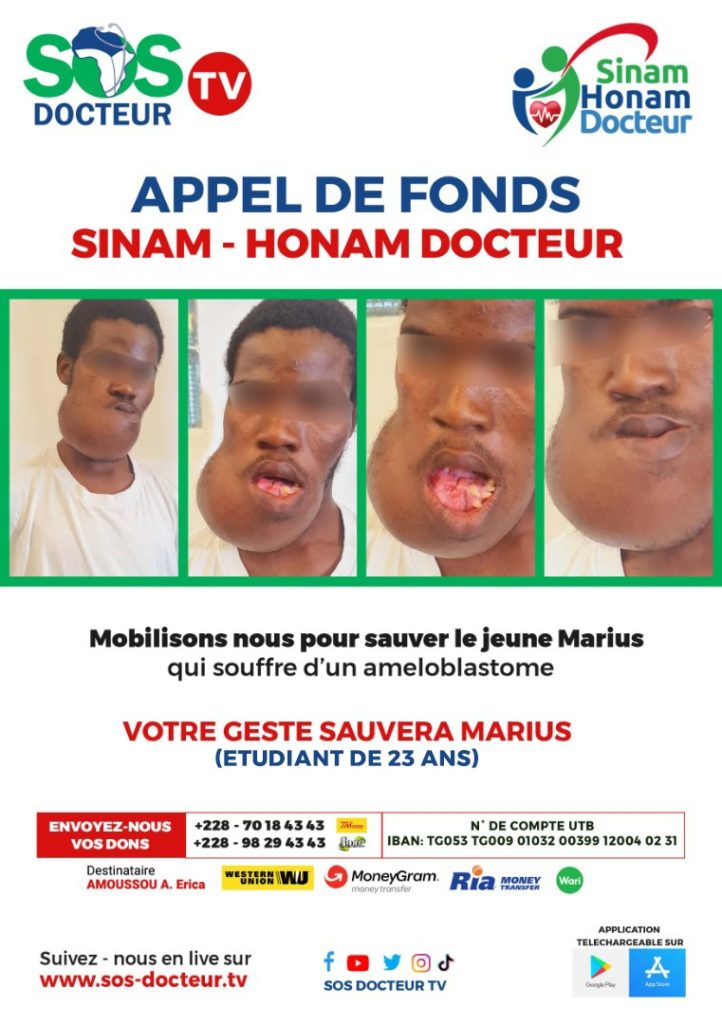 Depuis un moment, le jeune Marius âgé de 23 ans, souffre d’une maladie grave connue sous le nom d’améloblastome mandibulaire. Très touché par cette anomalie dont souffre le jeune Marius, SOS DOCTEUR TV pour l’apporter son soutien, a lancé en fin novembre 2022, à travers son émission Sina Honam Docteur un grand jeu de tombola.