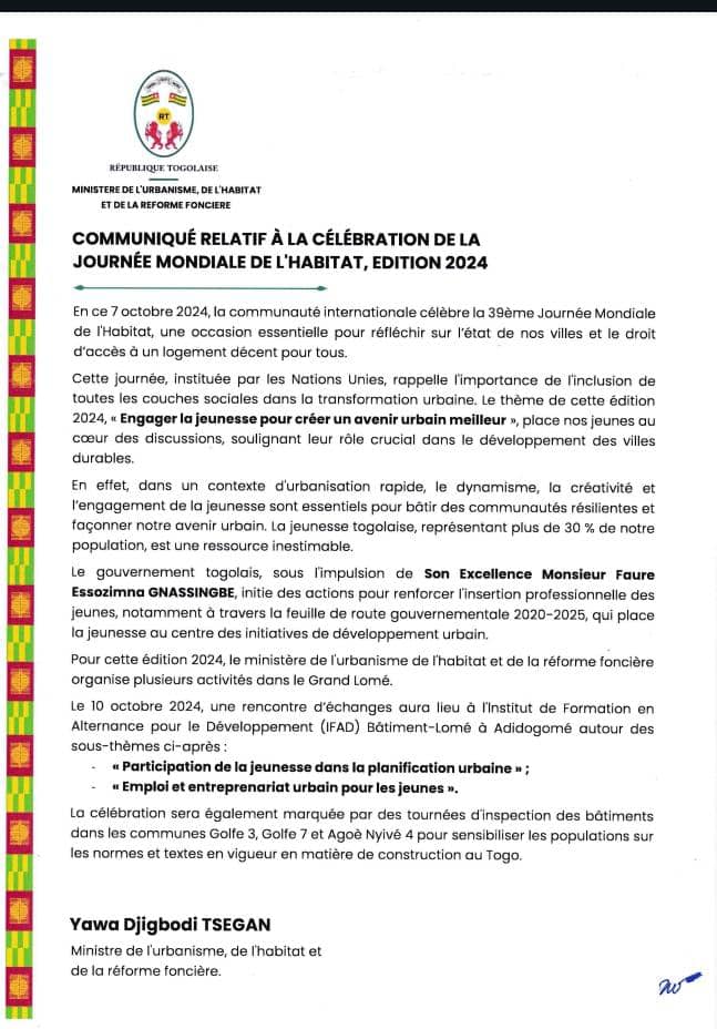 Le Togo célèbre ce lundi 07 octobre la journée mondiale de l’habitat. Cette édition 2024 est pour le gouvernement une occasion essentielle pour réfléchir sur l’état des villes et le droit d’accès au logement décent pour touts. A travers un communiqué le gouvernement invite la jeunesse a un engagement pour créer un avenir urbain meilleur.