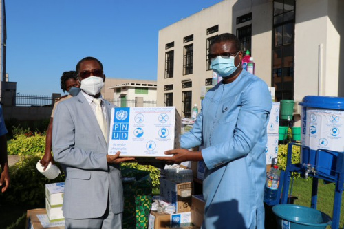 Le don, composé de 15 000 masques réutilisables, près de 10 000 flacons de gels hydroalcooliques, 50 thermoflashes et une trentaine de dispositifs de lavage de mains, a été remis par le représentant résident Aliou Dia au ministre de la Justice, Kokouvi Agbetomey.