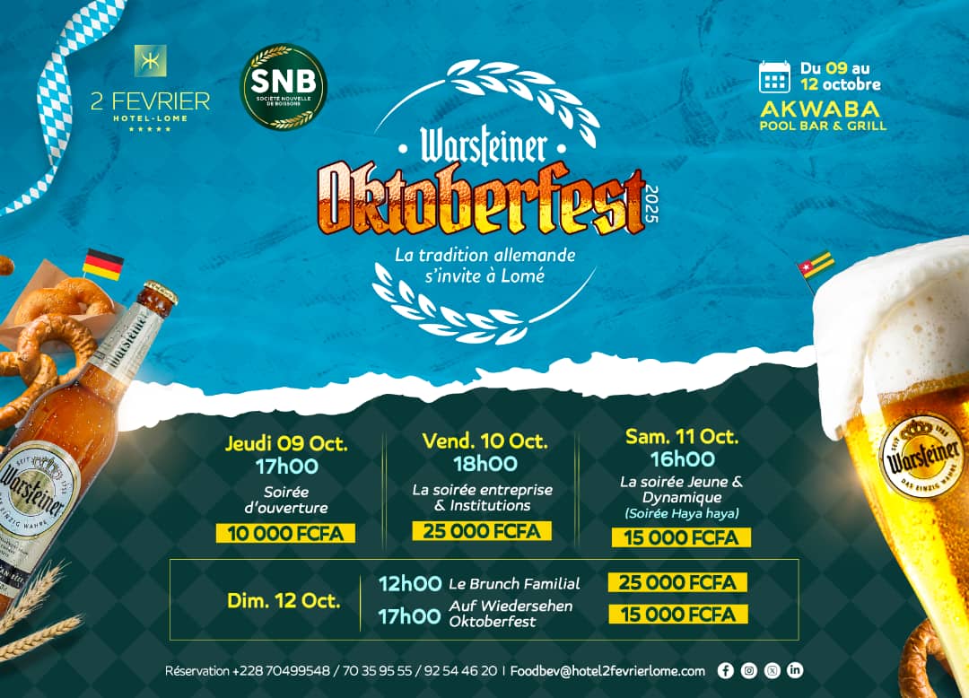 L’un des plus rendez-vous attendus dans la capitale togolaise, c’est bel et bien l’Oktoberfest qui va se dérouler à Akwaba pool bar & grill du 09 au 12 octobre 2025, autour de la piscine de l’Hôtel 2 Février. C’est une fête de la bière qui est organisée par la Société Nouvelle des Boissons (SNB) en collaboration avec l’hôtel 2 Février. Un hôtel de luxe 5 étoiles, prestigieux, leader et qui est situé au cœur du quartier administratif et à quelques minutes de la plage de Lomé.