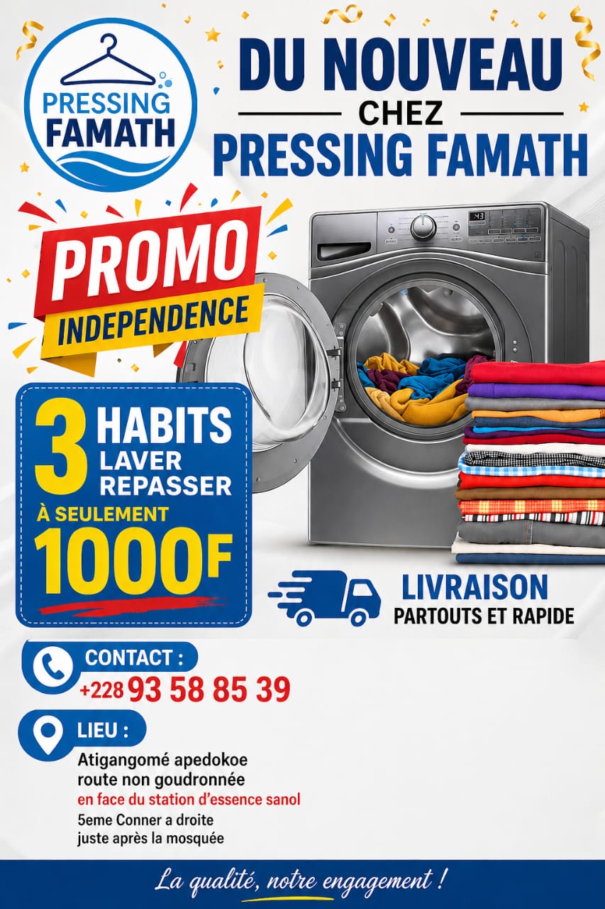 Profitez donc de cette Promo Indépendance chez Pressing Famath. C’est le moment de sortir vos plus belles tenues et de célébrer le Togo sans vous soucier du fer à repasser.