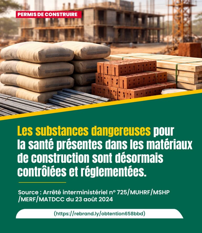 Le gouvernement togolais a pris une mesure importante pour protéger la santé publique et l’environnement en réglementant les substances dangereuses présentes dans les matériaux de construction. Un arrêté interministériel du 23 août 2024 fixe les règles pour identifier et gérer ces substances, qui peuvent avoir des effets néfastes sur la santé humaine et l’environnement.