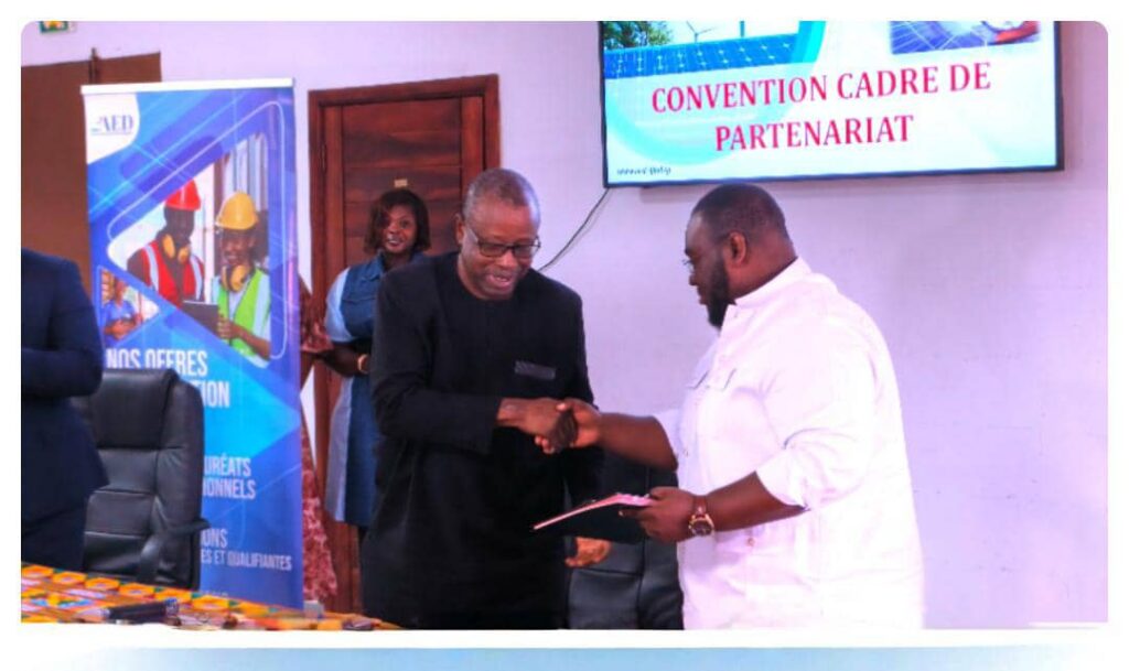 Un accord cadre a été signé ce vendredi 7 novembre 2025 à Lomé entre l’Agence Éducation-Développement (AED) et la Synergie des Acteurs des Énergies Renouvelables (SAER). L’initiative de ce partenariat qui s’étend sur une durée initiale de trois ans (2025-2028), renouvelable par tacite reconduction, est de renforcer la formation professionnelle et de favoriser la montée en compétences du capital humain dans le domaine des énergies renouvelables au Togo.