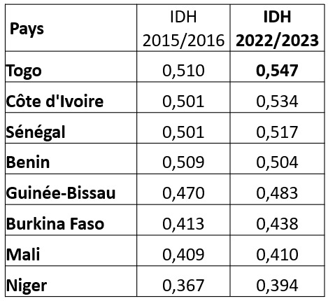 Le Togo se hisse pour la cinquième année consécutive au sommet de l’Indice de développement humain (IDH) au sein de l’Union économique et monétaire ouest-africaine (Uemoa). Il se place également au quatrième rang au sein de la Communauté économique des États de l’Afrique de l’Ouest (Cedeao). L’information a été révélée lors d’une cérémonie officielle de remise du rapport mardi 18 Juin à Lomé.